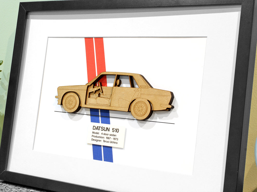Dieser lasergeschnittene Bauplan einer viertürigen Limousine vom Typ Datsun 510 ist ein tolles Geschenk und sieht in jedem Zuhause, Büro oder jeder Garage perfekt aus!