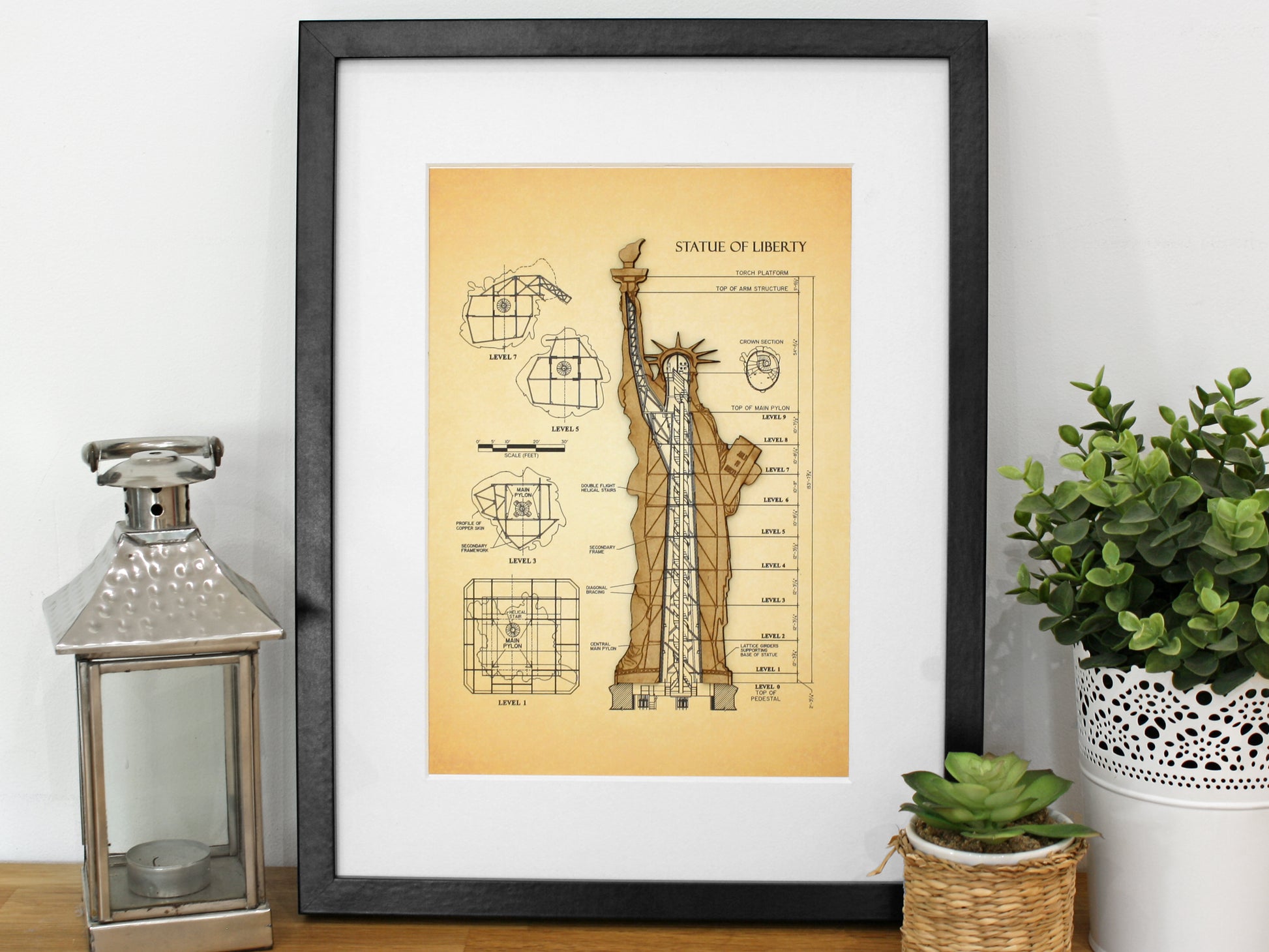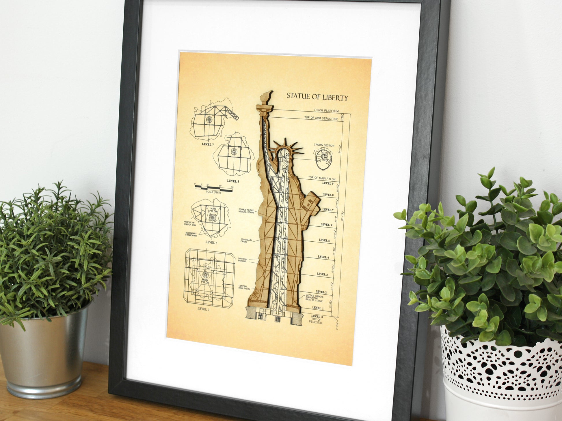 This stylish and interesting artwork features a cutaway blueprint of the iconic Statue of Liberty in New York.