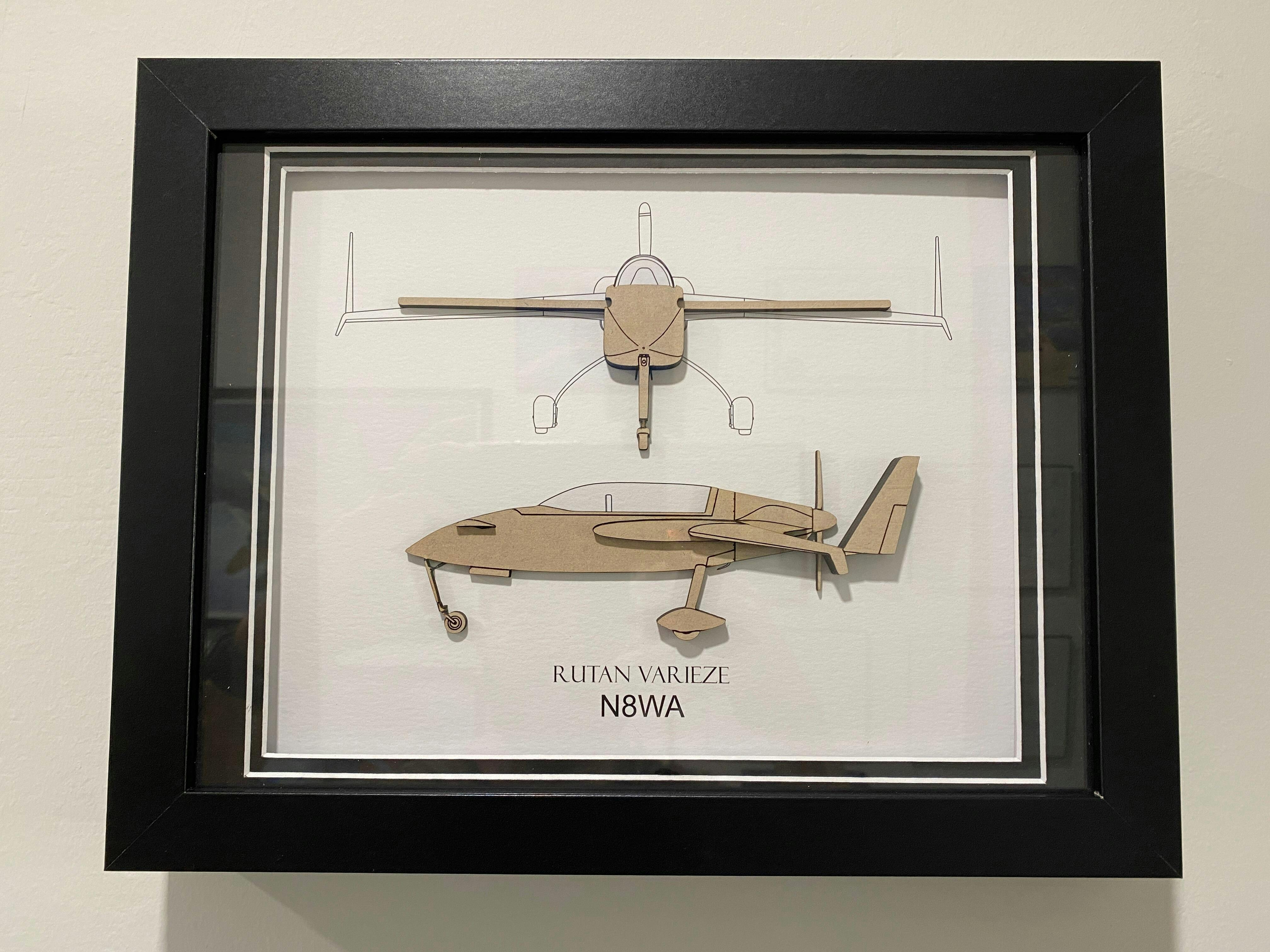 This eye-catching artwork featuring the Rutan VariEze is made using three layers of 1/8" (3mm) laser cut and engraved wood set over a printed background.