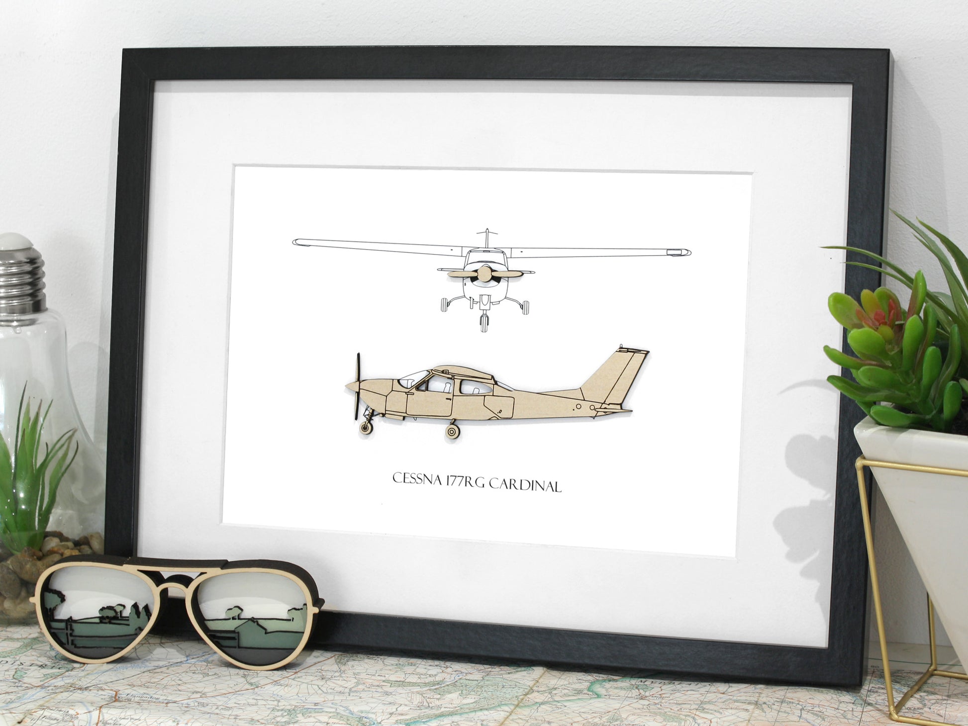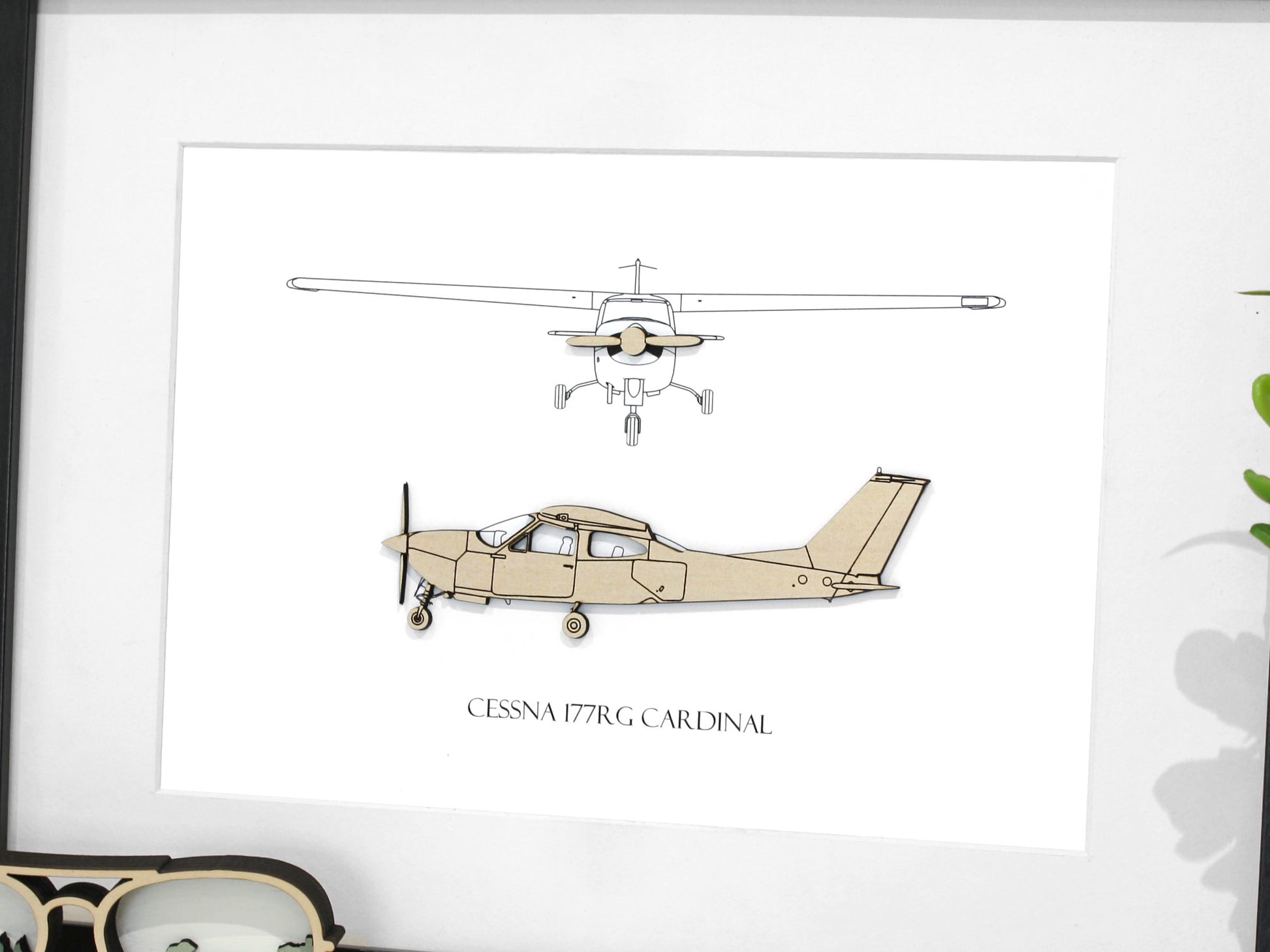 Cette œuvre d'art aéronautique élégante est réalisée à l'aide d'une combinaison de bois découpé au laser de 1/8" (3 mm) et d'un fond imprimé pour créer une image tridimensionnelle unique du Cessna 177RG Cardinal
