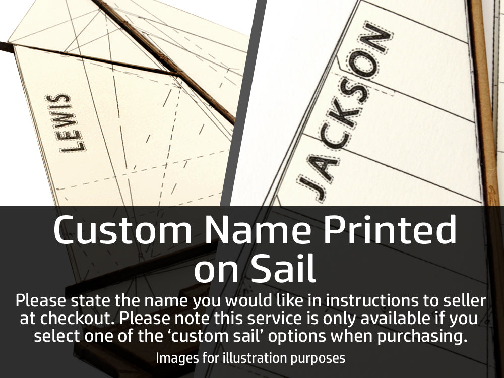 If the 'custom sail' option is selected a name can be printed on the main sail to personalize the artwork. The printed name has the appearance of sewn fabric to look as if it is part of the sail.